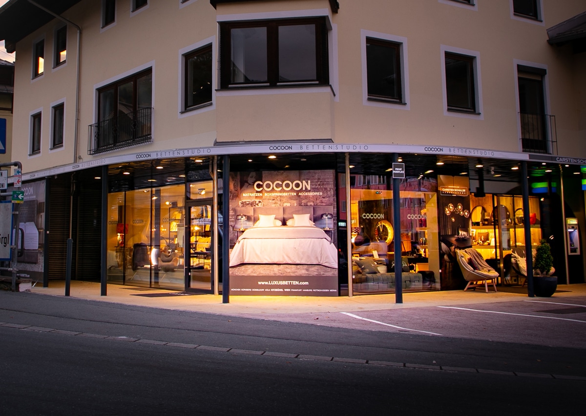 Das Bewusstsein um die Bedeutung von guter Schlafqualität prägt unser gesamtes Unternehmen. Die Geschwindigkeit des modernen Alltags kann es schwierig machen, Momente der Entspannung zu finden – Umso mehr sollten wir uns um einen Ort der Ruhe und Gemütlichkeit bemühen, um uns zu regenerieren und zu entspannen; einen Rückzugsort, um die wertvollen Batterien aufzutanken. Ein gutes Bett ist essenziell für eine angenehme und wohltuende Schlafqualität. Unsere hochwertigen Boxspringbetten in Kitzbühel wurden sorgfältig ausgewählt, um Ihren individuellen Schlafanforderungen gerecht zu werden. Unsere Schlafberater absolvieren regelmäßige Schulungen und können gemeinsam mit Ihnen in Kitzbühel ein Boxspringbett finden, das Ihren Schlaf positiv beeinflusst. COCOON verkauft nicht einfach Betten – wir wollen Ihnen ein beispielloses Schlafgefühl erzeugen – wir vereinen Luxus und Komfort. In unserer Filiale in Kitzbühel finden Sie Boxspringbetten hochwertiger Marken, die Ihnen eine neue Art von Regeneration kreieren.